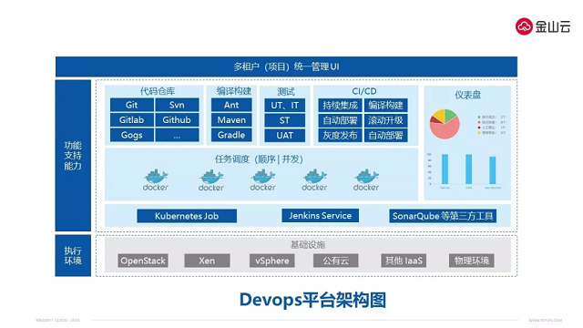 Devops平台从高层领导、项目管理者、项目组成员不同层次关注项目环节的不同场景出发,涵盖项目研发管理,研发流水线管理,质量管理与配置仓库管理,并以此为基础进行统计分析,将应用代码及其依赖封装成统一镜像,提高应用交付的效率,便于扩容,迁移,从应用角度实现了贯穿项目研发生命周期的各个环节,从多维提供研发管控应用。