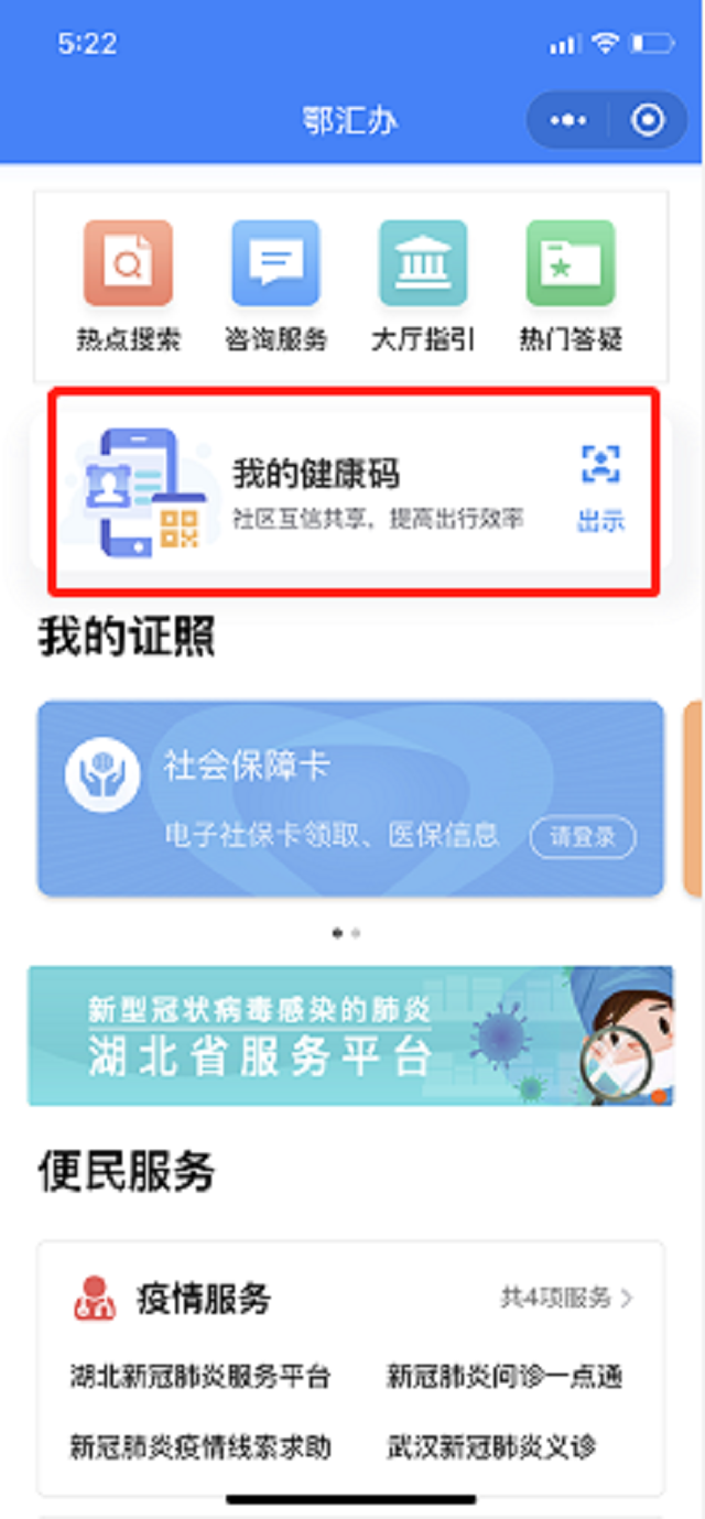 获取个人专属健康码的具体的方法是:进入 “鄂汇办”微信小程序-我的健康码。