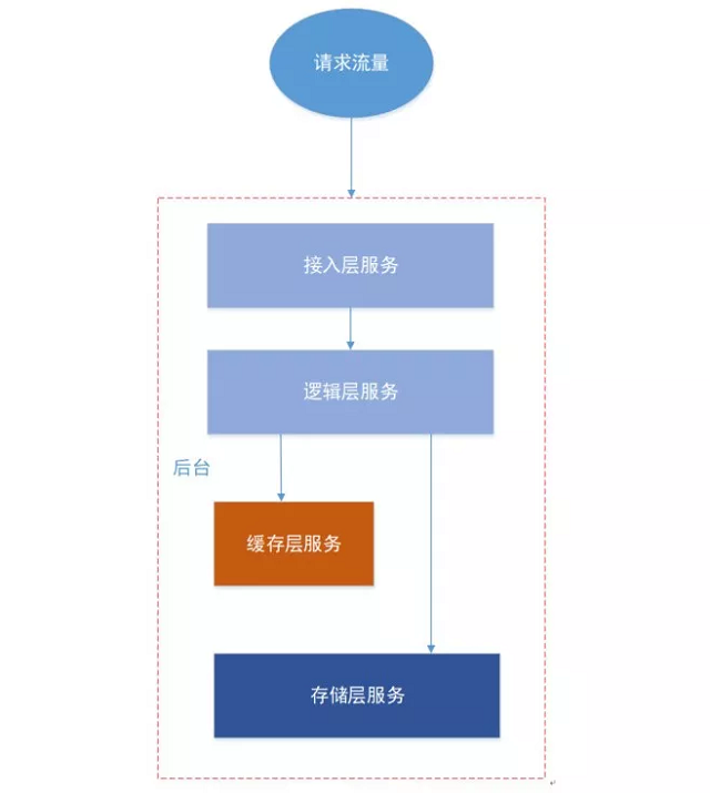接入层,一般用于请求的安全校验、频率和流量控制 逻辑层,用于用户数据的请求和返回逻辑控制 缓存层,为了加快访问性能,cache用户数据,常见的redis、memcache等 存储层,落地了用户各种数据,比如mysql、leveldb等
