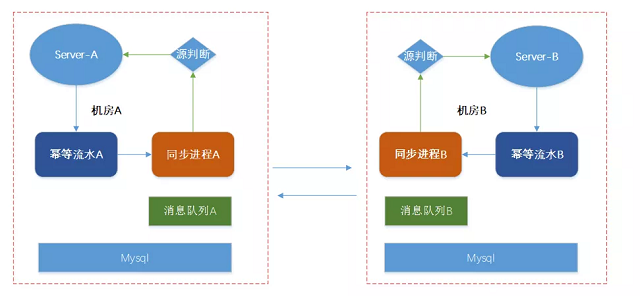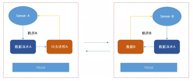 Server A的数据被同步进程A同步到B机房以后, 被写入到数据流水B,然后同步进程B又把这个流水同步给了A机房,就这样形成了一个循环回路浪费了网络带宽和资源。