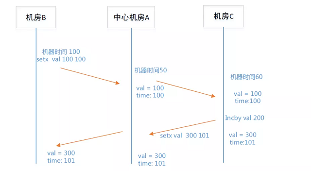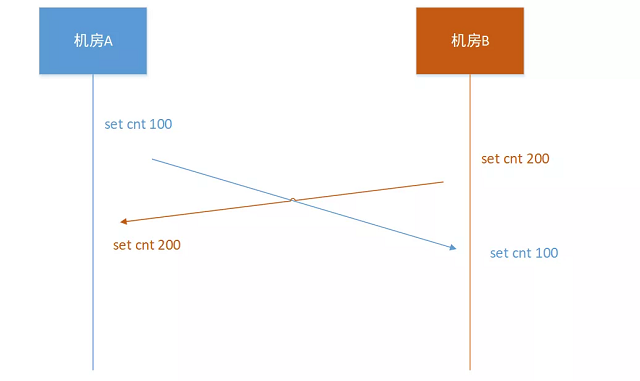 机房B,执行 “set cnt 200”, 时间戳是100,然后同步到机房A。