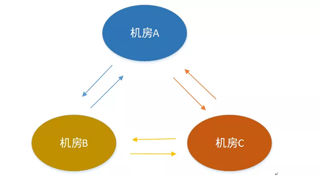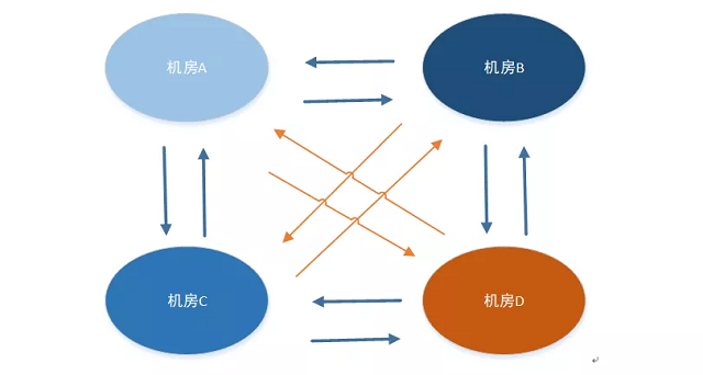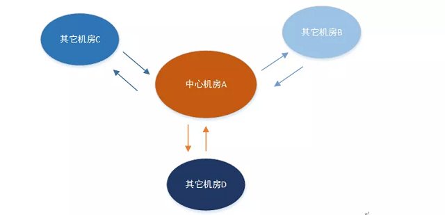 · 中心型:数据先同步到一个中心机房,然后由中心机房同步到其它的机房 · 两两相互型:机房之间数据相互同步,任意2个机房建立数据通道