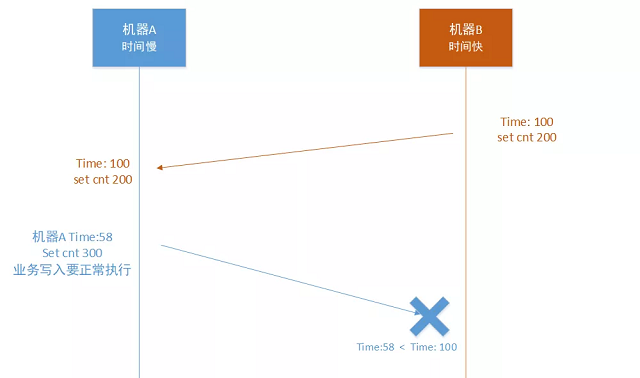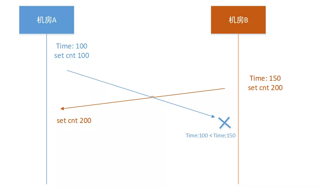 机房A,执行 “set cnt 300”,机房A的时间戳可能异常是58,因为是业务的正常写入,假设先不能拒绝,那么在此时机房A的内存状态是 cnt = 300,时间是58,当把这个状态同步到机房B的时候就会失败,因为A机房的时间58小于B机房的100。这个时候在A、B机房就存在相同key但是不同value的情况。