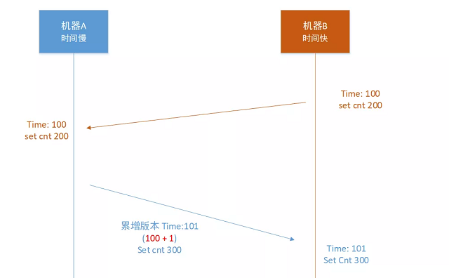 看看上面的问题在机器A设置数据“set cnt 300”时,因为本机A的机器时间比较慢获取到的时间戳是58,但是cnt本身的时间戳是100,这样的话在机房A的写入操作版本号就变小了,肯定无法同步到机房B的,如果这个时候代码发现cnt 的版本号大于机器的时间戳,就把版本号进行累增到101,这个时候就可以同步到机房B了。