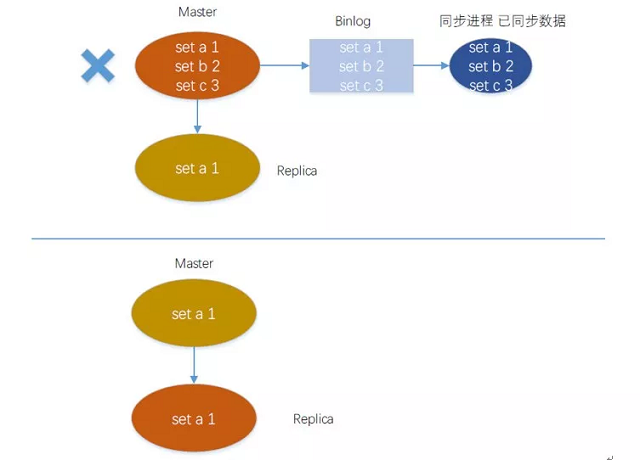 Master写入了a、b、c三个数据,同步进程也已经同步到了别的机房,如这个时候master宕机了,但是b、c还没有同步到Replication备机,就发生了主备切换,Replication成为新的master,但是没有b、c这2个数据,而别的机房还存在这2个数据。