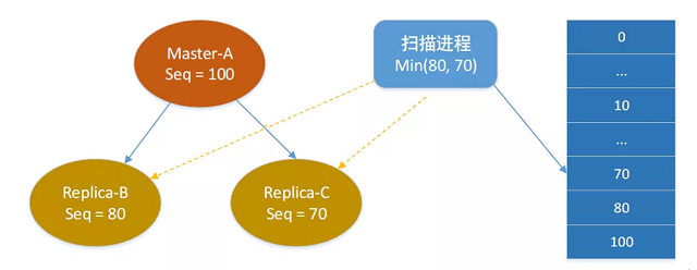 比如master的seq是100,但是replica的seq是80,这个时候我们的扫描同步进程只要同步80之前的binlog流水同步到别的机房就没有问题,而80~100的binlog流水则先不同步。