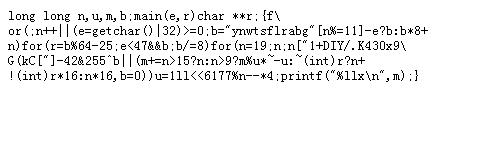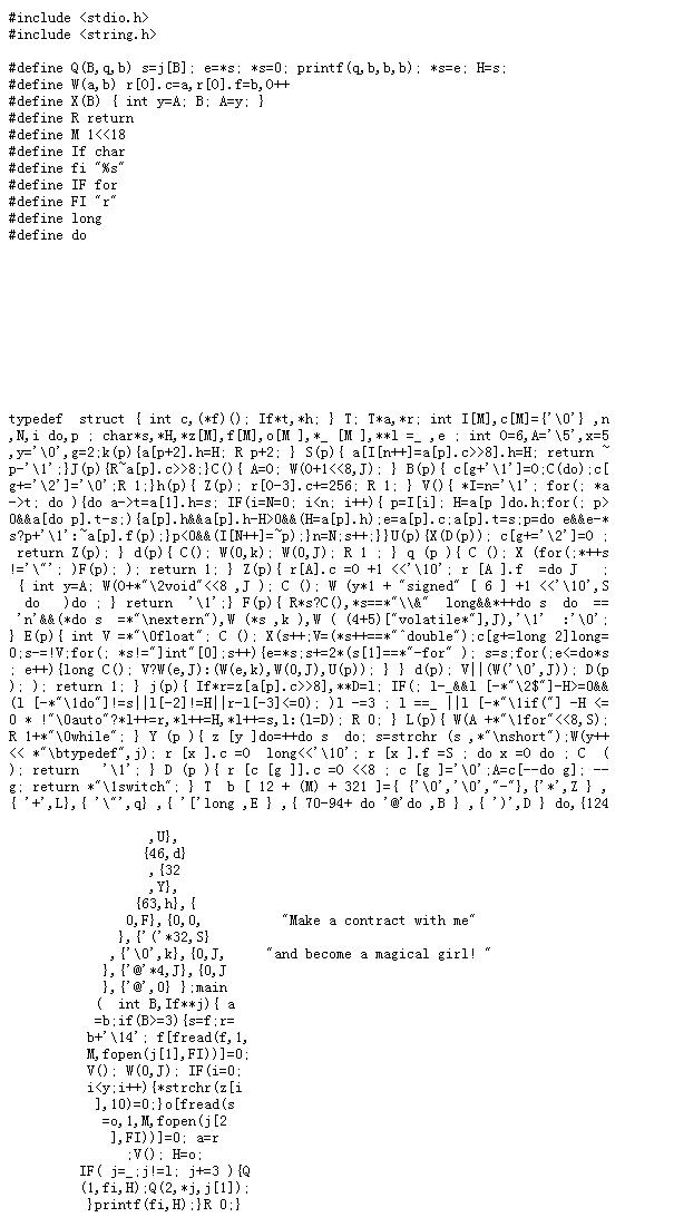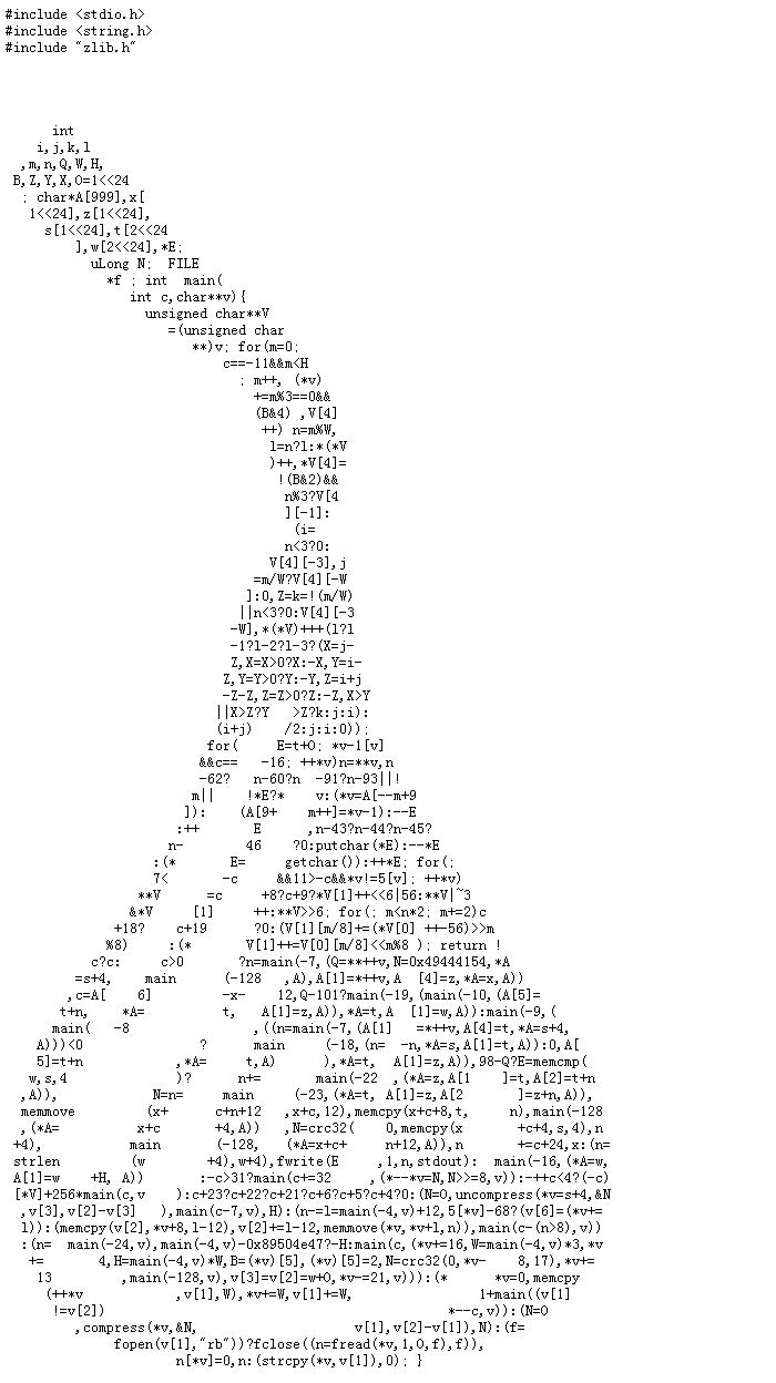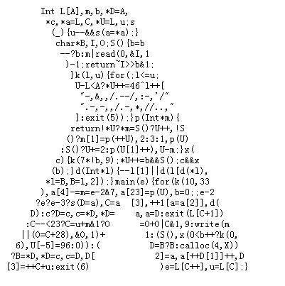 IOCCC是由蓝登·克特·诺尔(Landon Curt Noll)与拉里·贝索(Larry Bassel)在1984年受雇于国家半导体(National Semiconductor)的Genix程序移殖事业群时开始的。比赛的点子是来自他们俩比较彼此有关于它们得修正的某些写得很烂代码的笔记。 作品从联机提交,并经过好几回合的裁判的审核。作品审核是基于滥用混乱代码的程度(以及创造性的滥用)。作品通过最后一轮审核的会被归成其特别的一类以示嘉奖,例如“最滥用C预处理器”或者“最古怪的行为”,并且发表在官方IOCCC网站。作品没有通过者会被删除或遗忘;该赛事主办声明:作品被声明在IOCCC网站是竞赛的锦标。 第21届国际C语言混乱代码大赛(IOCCC)于9月30日公布了获胜者名单。获胜者的源代码也已正式发布。其中最有用混乱代码是中国程序员Qiming HOU(他也是20届IOCCC的获奖者之一)的语法高亮器,其他获奖作品包括Don Yang(同是20届IOCCC的获奖者)的 Encodes text as a C program 等。获胜者包括1名法国人,1名韩国人,5名美国人,1名比利时人,1名以色列人,1名英国人,4名日本人和1名中国人。 下面罗列几份获奖代码给大家仰视下~~~ 最佳短程序奖:韩国 Seonghoon Kang 最强大功能奖:美国 John Tromp