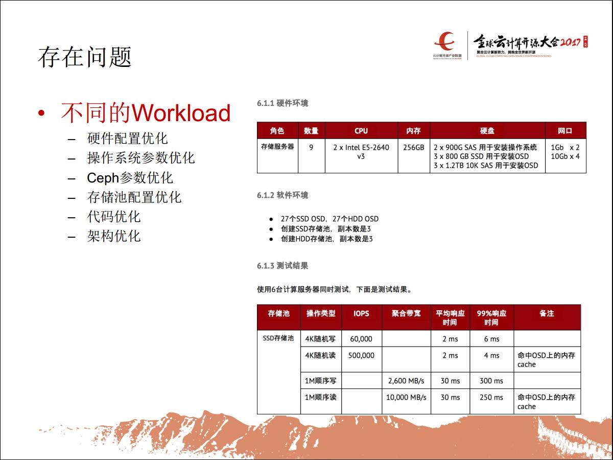 另外一个问题,不同的Workload我们怎么优化,比如有些对容量有要求,所以我们可以做一些优化服务,比如硬件配置的优化,还有操作系统参数优化,因为我们知道有缺点会做一个调优,而且把它CPU全部榨干。