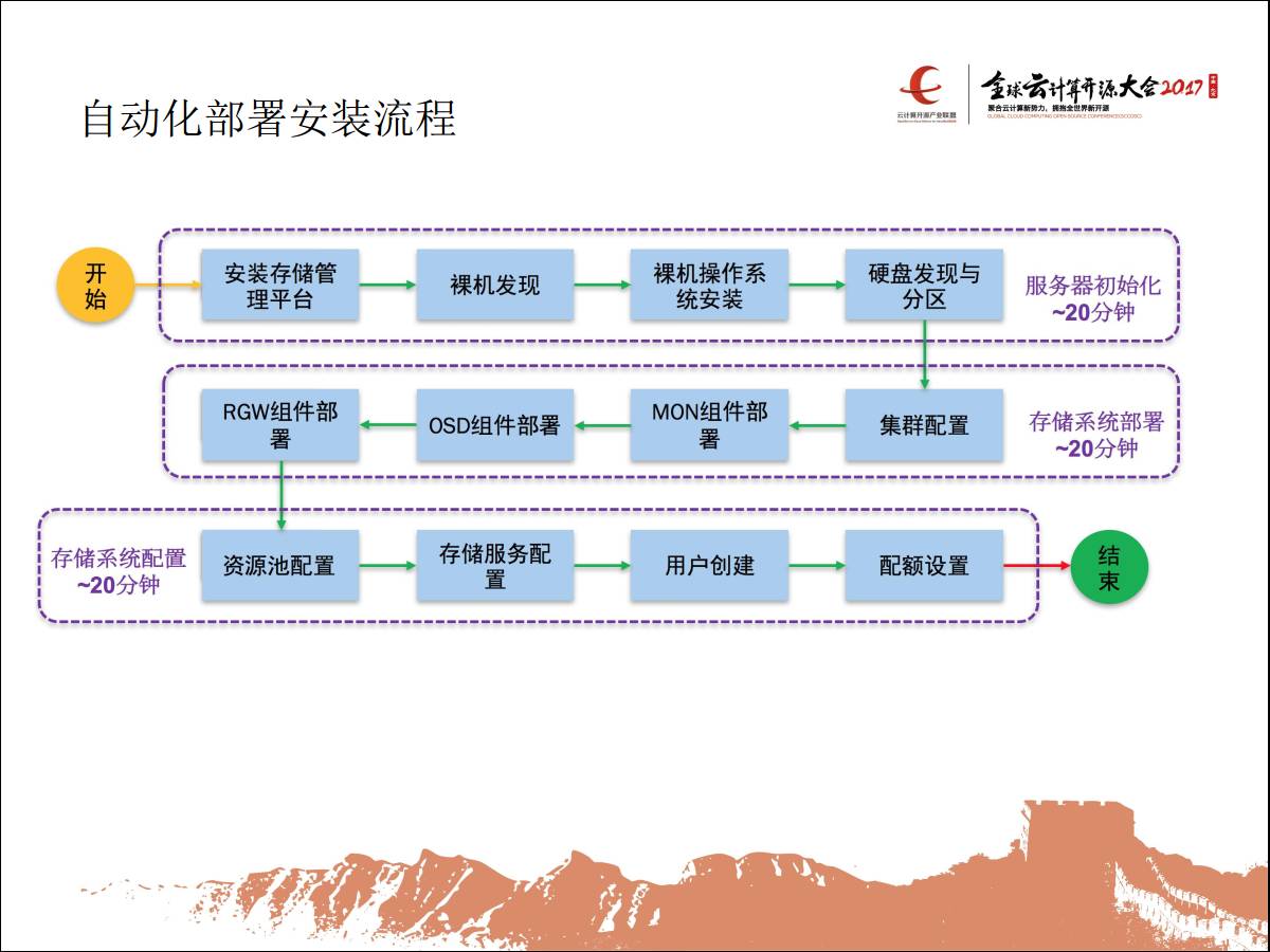 还有Ceph的参数优化,存储池配置优化,可以做一些代码的优化,还有架构优化。还有大规模部署的问题,比如你部署一两百台Ceph集群怎么做,像推土机一个小时部署起来,这涉及到Ceph集群生命周期管理,还有自动化图形部署工具。