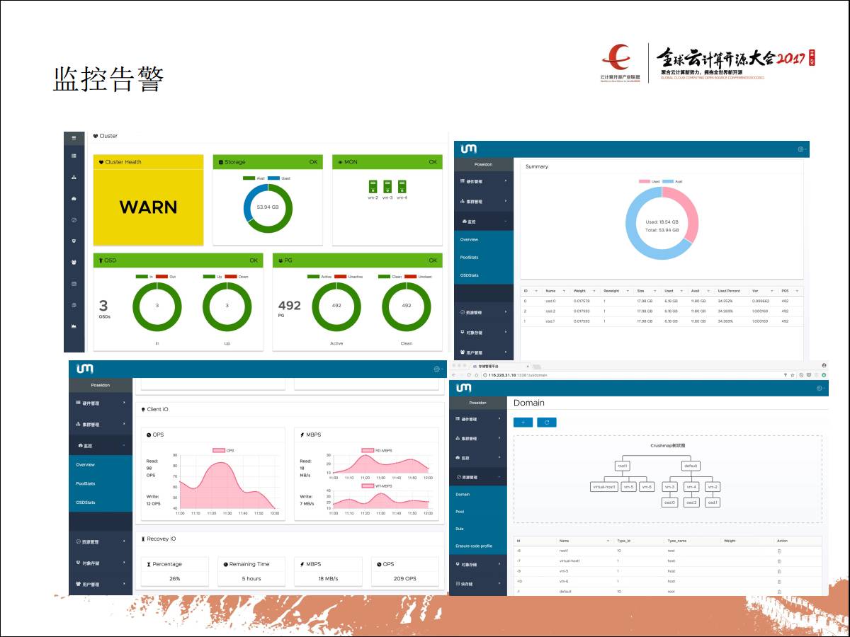 下面还有一个报警的工具。我们业提供产品,会有一个平台主要是做管理和部署,目标是一个人一小时交付大规模的Ceph集群,像服务器初始化都可以通过图形化的界面做操作,这是一个自动化部署安装流程,刚开始部署的时候可能每一步都是你需要敲命令或者用其他配置起来,通过图形化的界面可以把这些全部变更。