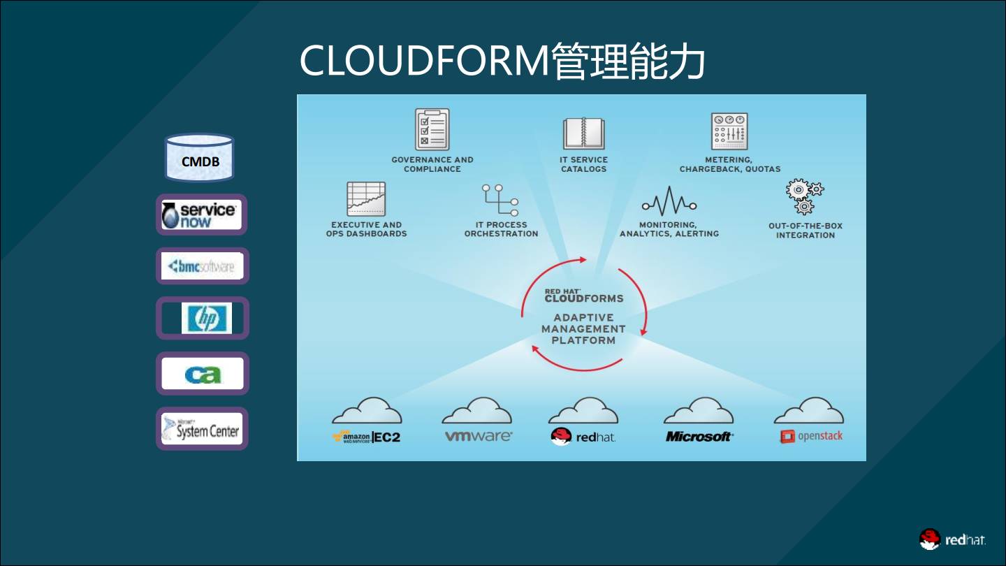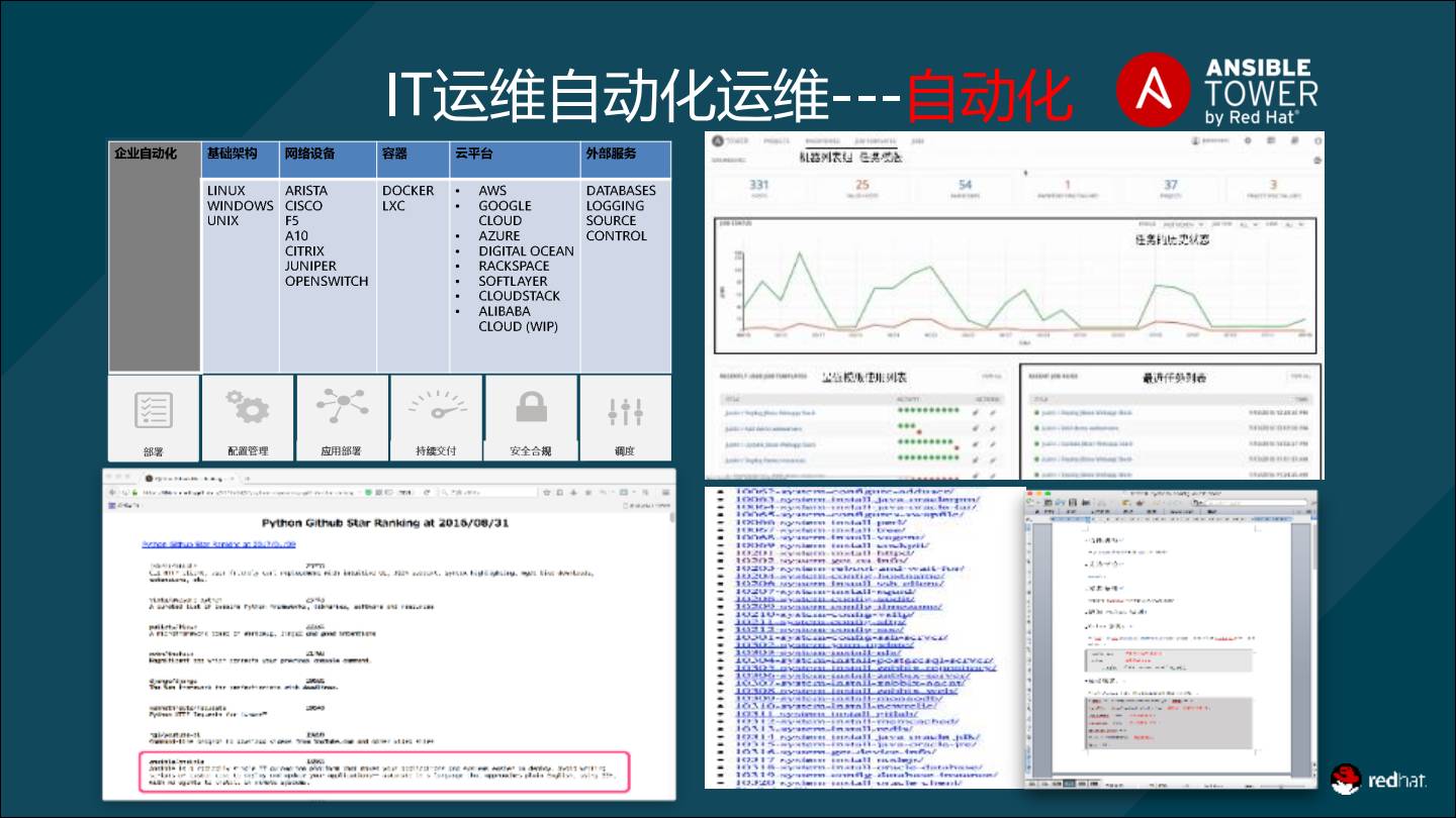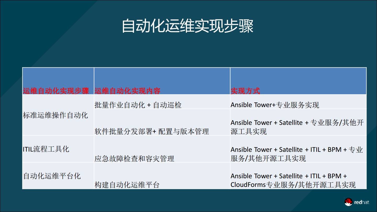 satellite则在系统部署、订阅管理、软件管理、配置管理四方面帮助客户实现IT运维标准化。 红帽云管平台Cloudforms,可以与AnsibleTower和Satellite对接,实现云平台管理与运维统一。 那么,IT自动化运维平台架构如何落地?