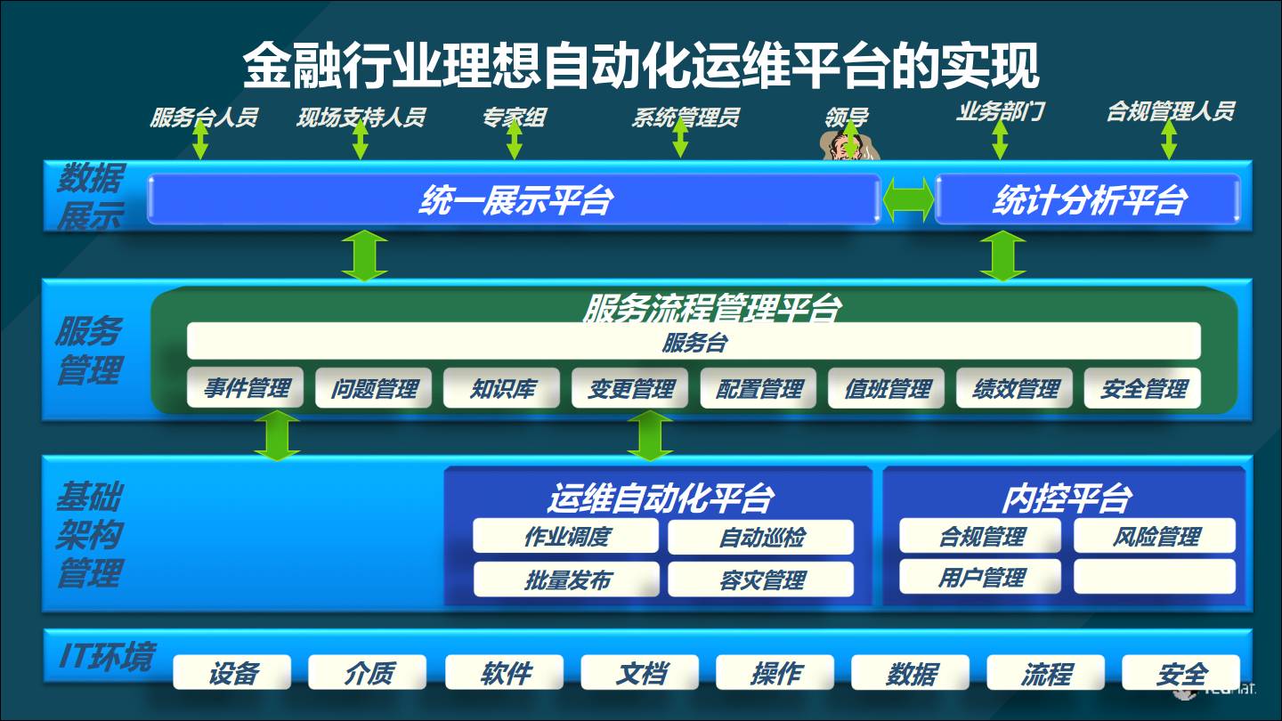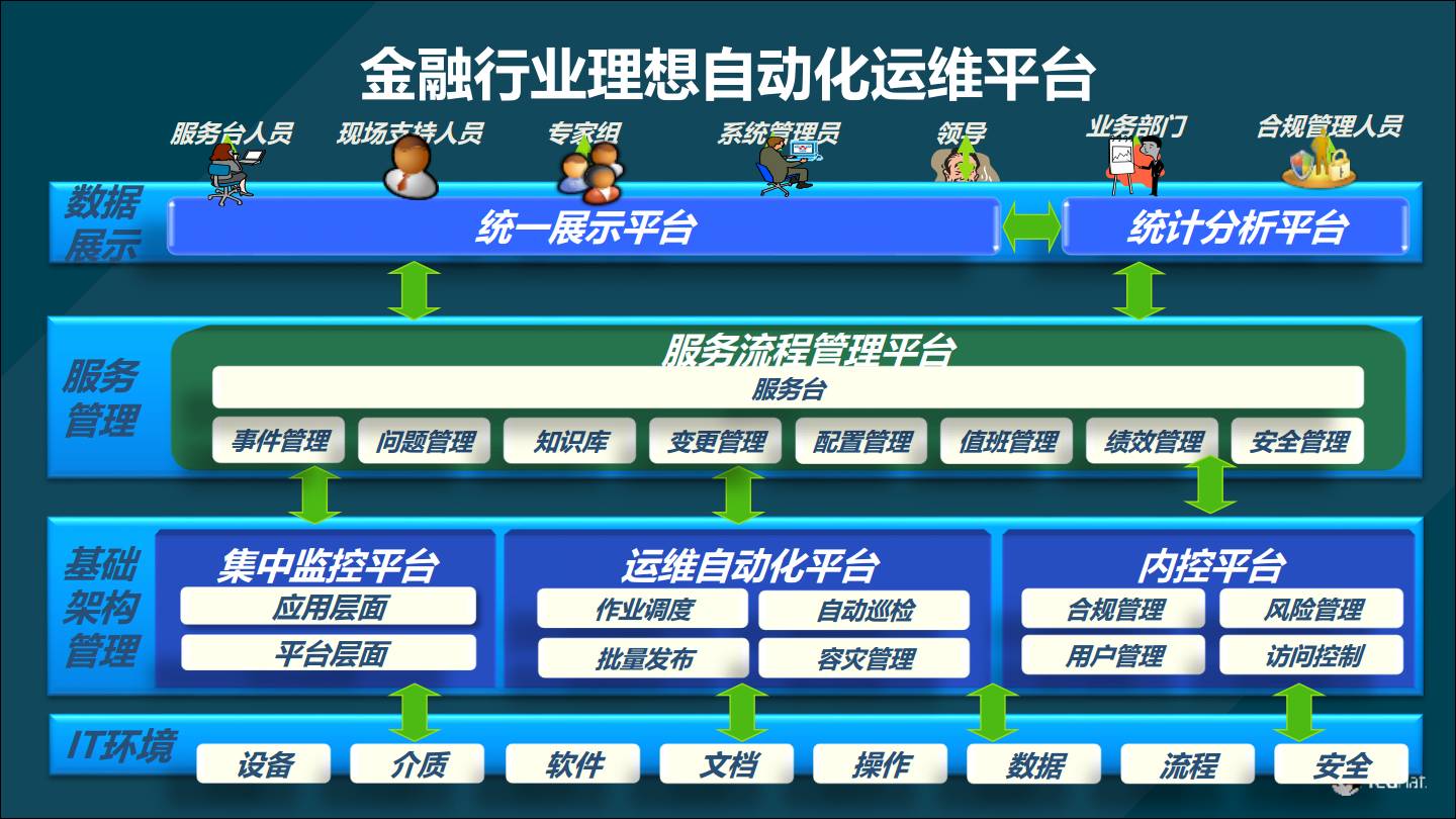 IT环境层,指的是自动化运维平台需要纳管的对象。在一个复杂的数据中心中,运维绝不是仅仅针对一种操作系统,或者一种型号的服务器。而是整个数据中心,包括(但不限于): 1.系统层面:从Linux(物理机、虚拟机、云环境), Unix,到Windows。 2.虚拟化平台:VMware、Docker、Cloudstack、LXC、Openstack等。 3.商业化硬件:F5、ASA、Citrix、Eos以及各种服务器设备的管理。 4.系统应用层:Apache、Zabbix、Rabbitmq、SVN、GIT等. 5.商业化软件如:Openshift、Ceph、Gluster、Oracle等。 6.云平台:支持的云平台有AWS、Azure、Cloudflare、Red Hat CloudForms、Google、Linode、Digital Ocean等。 基础架构管理层 基础架构管理层的职责分为三大块:集中监控、运维自动化平台、内控平台。 1.集中监控平台包含平台(如虚拟化平台)监控和应用(如oracle数据库)监控。 2.运维自动化平台,它是基础架构管理层的核心组件。它需要完成四类操作:作业调度、自动巡检、批量发布、容灾管理。也就是说,运维自动化平台必须能够驱动IT环境层的七种对象。 3.内控平台,主要负责合规控制。它完成:合规管理、风险管理、用户管理、访问控制。 整体而言,在基础架构管理层中,运维自动化平台是最关键的,它是管理层的发动机。而集中监控平台和内控平台则是辅助自动化平台的。前者负责运维自动化的全生命周期管理,后者负责运维自动化平台的合规和安全。 服务管理层 服务管理层通常通过ITIL等架构理念,与客户的规章制度与业务流程匹配,需要做定制化开发。目前绝大多数金融行业用户都有流程,只是体现在纸面上。需要做的是将纸面上的流程IT工具化。 数据展示层: 主要是面向企业内部IT和非IT部门的内容用户。做统一的门户。过这个统一的平台,内部用户可以访问这个平台。通常情况,运维门户会与客户的云门户统一。 金融行业客户自动化运维平台实施步骤