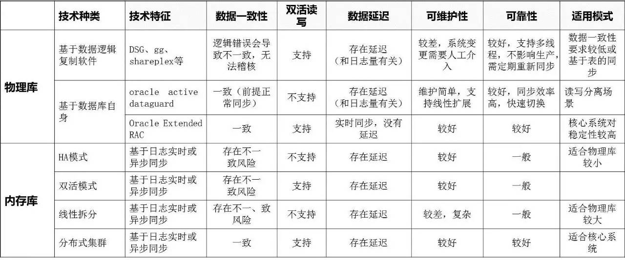 内存库通过复制手段,实时地复制到另外一个中心,它们之间是一个跨中心的数据,这是HA模式。另外双活模式,和这个模式是HA模式的延伸,可能一部分表是一个方向复制,另外一些表反过来。还有一种是线性拆分模式,将内存数据放在多个内存库集群中,每个内存库存放一部分数据,并互为备份,这种模式需要应用进行针对性改造。分布式集群模式,自动实现不同数据分片和副本机制,是目前比较流行的一种结构。 数据层双活技术比较