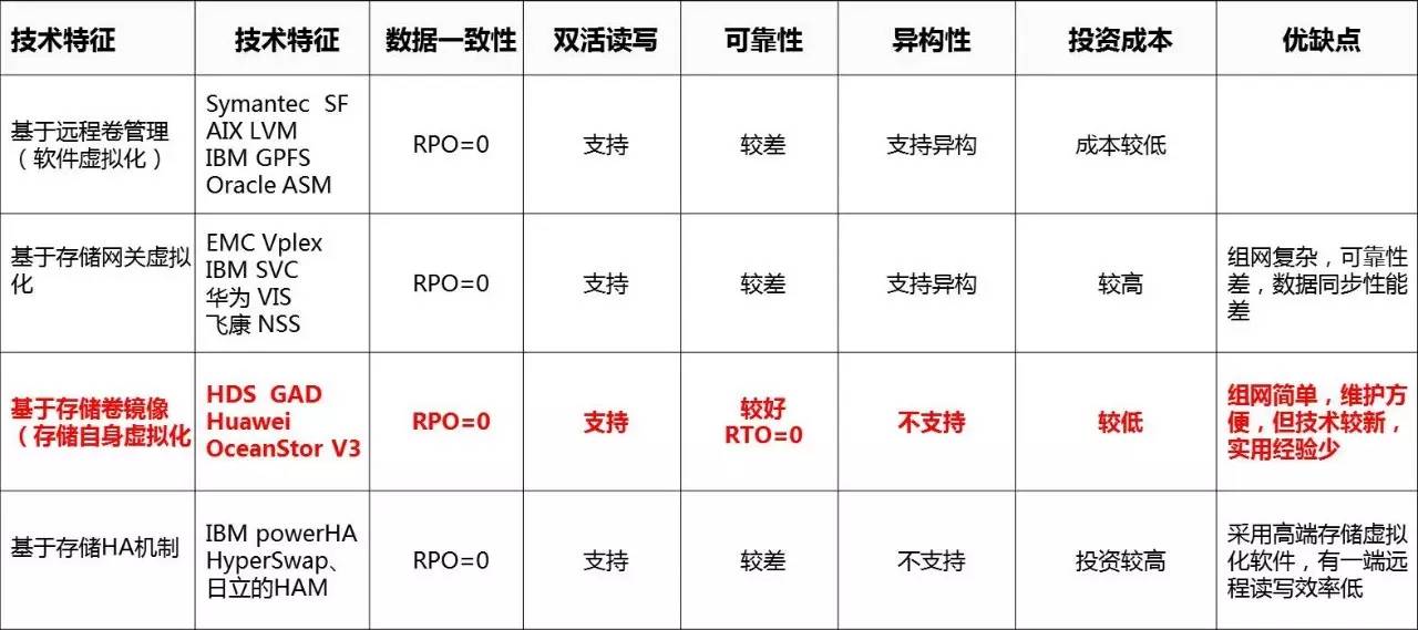 这是一个存储自身卷的镜像,这是一些新的设备情况,它的优点,整个网络架构没有改变,从主机到交换机到存储,也没有增加任何的设备,这种是相对来说比较易于实行(也需要一个仲裁站点)。 存储层双活技术对比