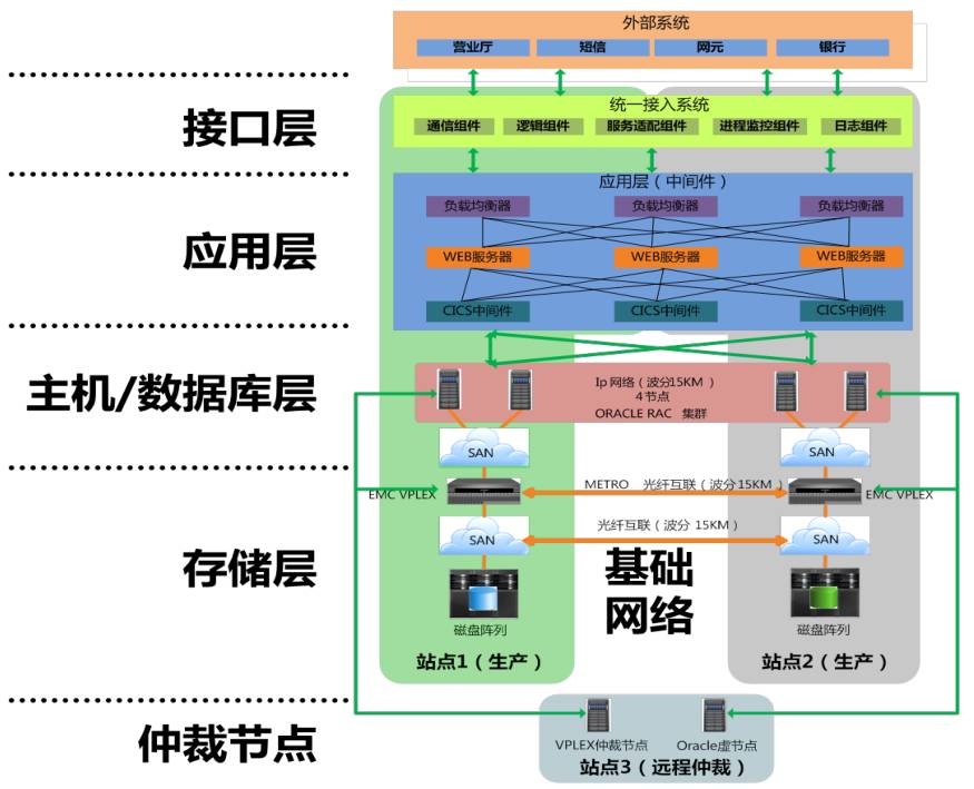 这是一个存储层的双活技术比较,容灾技术有2个重要参数,RPO(故障恢复点)和RTO(故障恢复时间)。这几种理论上都能实现RPO等于0,也能支持双活读写。从可靠性来看,这个数据不是完全决定的,需要根据实际情况定。从异构性来说,除了存储自身虚拟化和存储HA机制不支持外,其余都支持。但不管存储双活有哪几种,双活都需要用到远程Extend RAC。 三、接入/应用层下图是一个例子,一个比较前端的系统,分为接入/接口层、应用层、主机/数据库层、存储层等,各个层面统筹考虑双活机制,才能实现零切换。首先不能像原来烟筒式的数据库连接,应考虑统一数据库访问接口,并实现应用自动重联机制,确保自动切换,减少人工切换。在应用层,则考虑双中心部署相同的应用集群方式,或跨中心的集群方式。