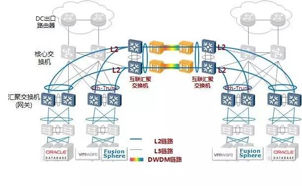 第二个方案是采用二层光纤直连技术打通。每个中心部署互联汇聚交换机,中心内的汇聚(网关)交换机通过链路聚合接入该互联汇聚交换机,互联汇聚交换机通过链路聚合接入波分设备,链路聚合保证整网无二层环路。同时在汇聚互联交换机配置二层风暴抑制。