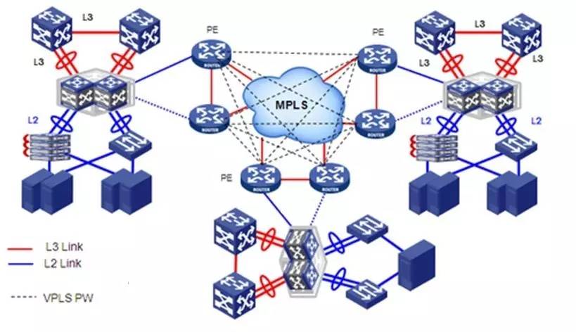 第三种基于MPLS网络的VPLS互联。每个中心的核心交换机与专用的MPLS域专用网络直连,通过MPLS专属网络的本地PE设备与对端中心的机房PE设备之间建立VPN,将各个PE设备所互连的二层网络通过MPLS VPN方式建立二层互通。