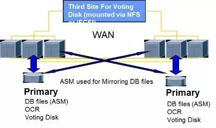 通过DSG、GoldenGate等逻辑复制软件技术实现跨中心数据库的相互复制,这种逻辑复制支持表级的复制,要求两个数据中心各建一套数据库,物理独立,同时能读写。基于数据库日志准实时复制数据,支持异构数据库,异构OS。可以实现一对一、一对多,多对一、双向复制等多种拓扑结构。把日志进行分析,写到这个库,是以跨中心的共享存储基础,通过共享存储资源和Oracle数据库集群软件管理,实现各个中心节点对数据库并行访问。 方式三:Oracle 远程RACOracle Extended RAC以跨中心共享存储为基础,通过共享存储资源和Oracle Clusterware数据库集群管理,实现各个中心节点对数据库并行访问。