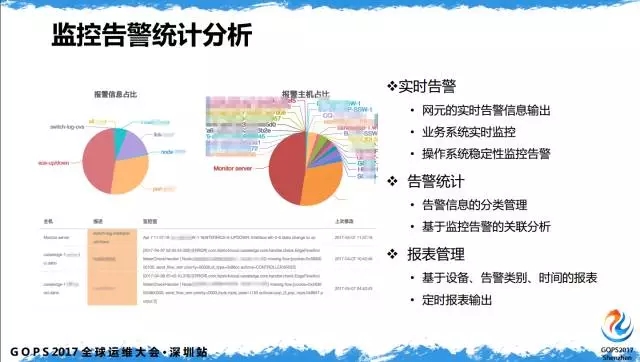 告警统计分析,拿到告警原始数据后,如何更好的展现出来,如何把有用的信息实时同步。实时告警不像传统网络只有底层转发,这涉及业务系统的实时监控和网元实时监控,包括操作系统稳定性的监控,都会统一的在一个监控平台做。 告警统计,需要对所有告警信息做分类管理,只有把有用的信息分类后,才能进行第二步分析。报表管理,很多 SLI 和 SLO 的来自于报表,不管是设备、链路、系统的可用性从何而来,这是通过告警统计分析报表功能输出,你可以定月、定周对设备、链路做SLA需要的统计。 4.4 日志统计分析