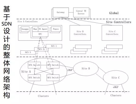 这是基于 SDN 设计的网络架构图,也可以在 internet 上找到,这是 Google 前几年的设计图。底层是转发网元,分为不同的 Site,中间是控制面。在中间层的时候,controller 使用不同的功能模块实现对底层网元的控制。流量的调度和优化在最上层的 TE server 上做。 3.3 SDN NetDevOps