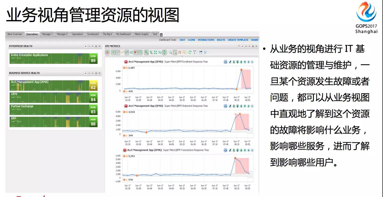 从业务的视角进行IT基础资源的管理与维护,一旦某个资源发生故障或问题,都可以从业务视图中直观地了解到这个资源的故障将影响什么业务影响哪些服务,进而了解到影响哪些用户。 数据库慢了,CPU突然飙升了,这些地方这些资源突然发生变化了之后,影响到哪些业务呢?这时候就需要将监控资源视图和业务关联起来,这样才能准确定位影响了哪些业务。