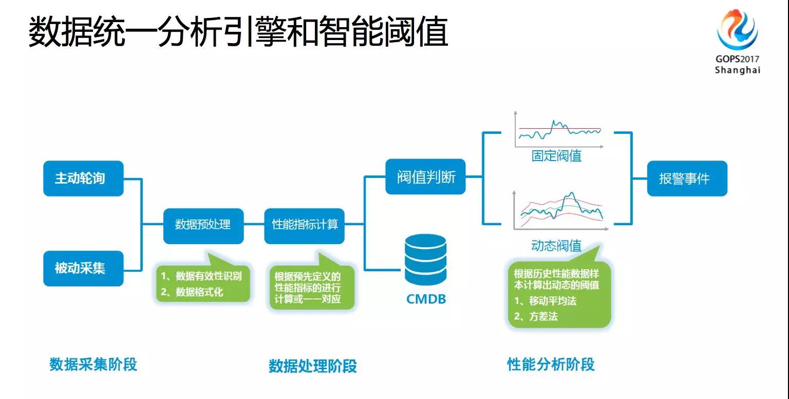 数据采集有两种类型,一种是被动的,一种是主动的。 采集业务相关指标,可以对数据进行预处理,做一些有效性的标签识别,比如这个信息和指标是不是你关注的,对不友好的日志进行格式化处理。 性能指标的计算,要跟业务进行协同,从业务的角度来定义。设置的 阈值,有些场景是固定的,也有的场景是动态的。固定阈值就相当于资源使用率,肯定有一个上限的。动态阈值像一些性能曲线,CPU的利用率、页面响应、图片加载等这些是可以使用动态阈值的,根据历史数据来计算出这个动态阈值,某一时刻的历史峰值,根据这些合理计算出在那个时刻到底需要多少资源。 根据上面的阈值会有一个报警的事件,任何事件产生都是基于时间的,故障的定位肯定也要基于时间找到相关的日志和发生的事件。