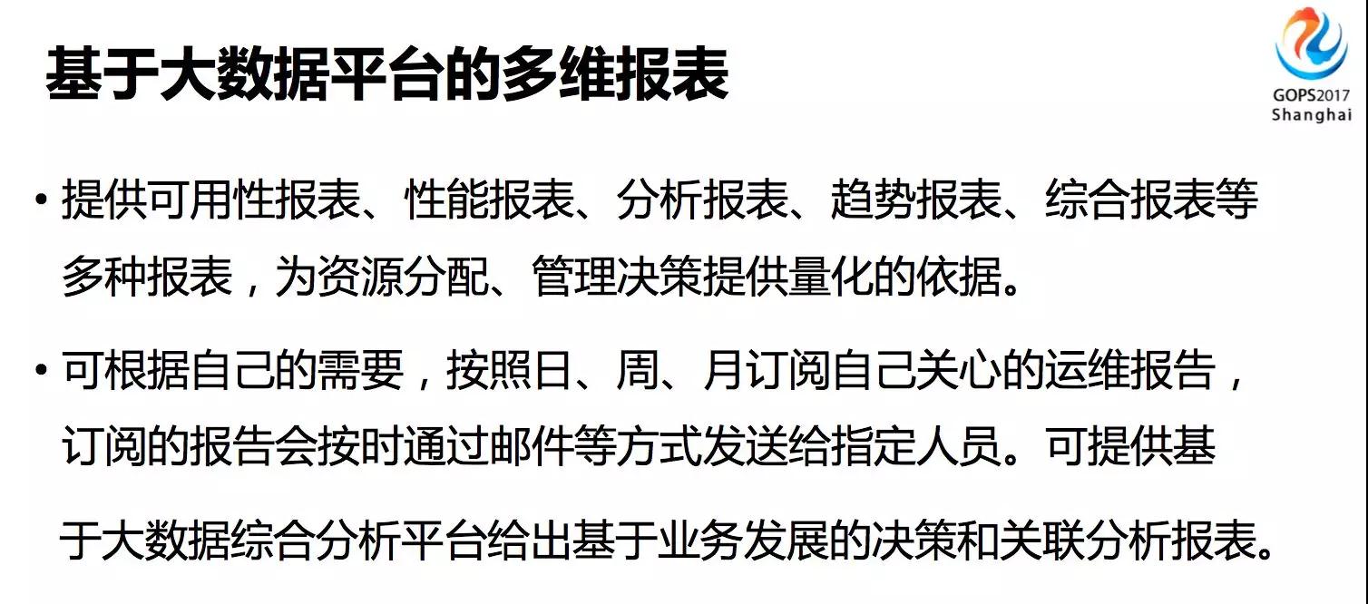 基于大数据平台的多维报表,根据自己的需要,按照日、周、月来生成运维报告,发送给管理层的领导,这些数据是他们比较关心的,比较清晰的图示出在这些时段发生了哪些问题,造成了多大面的影响,然后决定相关的资源是否进行扩充,相应的业务部署是否需要调整。