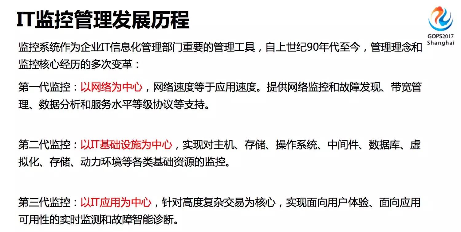 IT监控管理的发展大概有三代,从上世纪九十年代至今,第一代是以网络为中心,在这个时期咱们提供比较多的都是基于网络的监控和故障发现,带宽管理和服务水平协议。 第二代监控就是以监控IT基础设施为中心,看到比较多的就是主机、存储、操作系统、中间件、数据库等各类基础资源的监控。 第三代监控以IT应用为中心,针对比较高度复杂的交易,需要实现面向用户体验和面向应用高可用性的实时监测和故障的智能诊断,运维人员必须高屋建瓴、全面谋划,有能力提供一个全局性、高效健壮、标准规范、自动化的监控解决方案并加以实现。 五、故障管理及自治自愈
