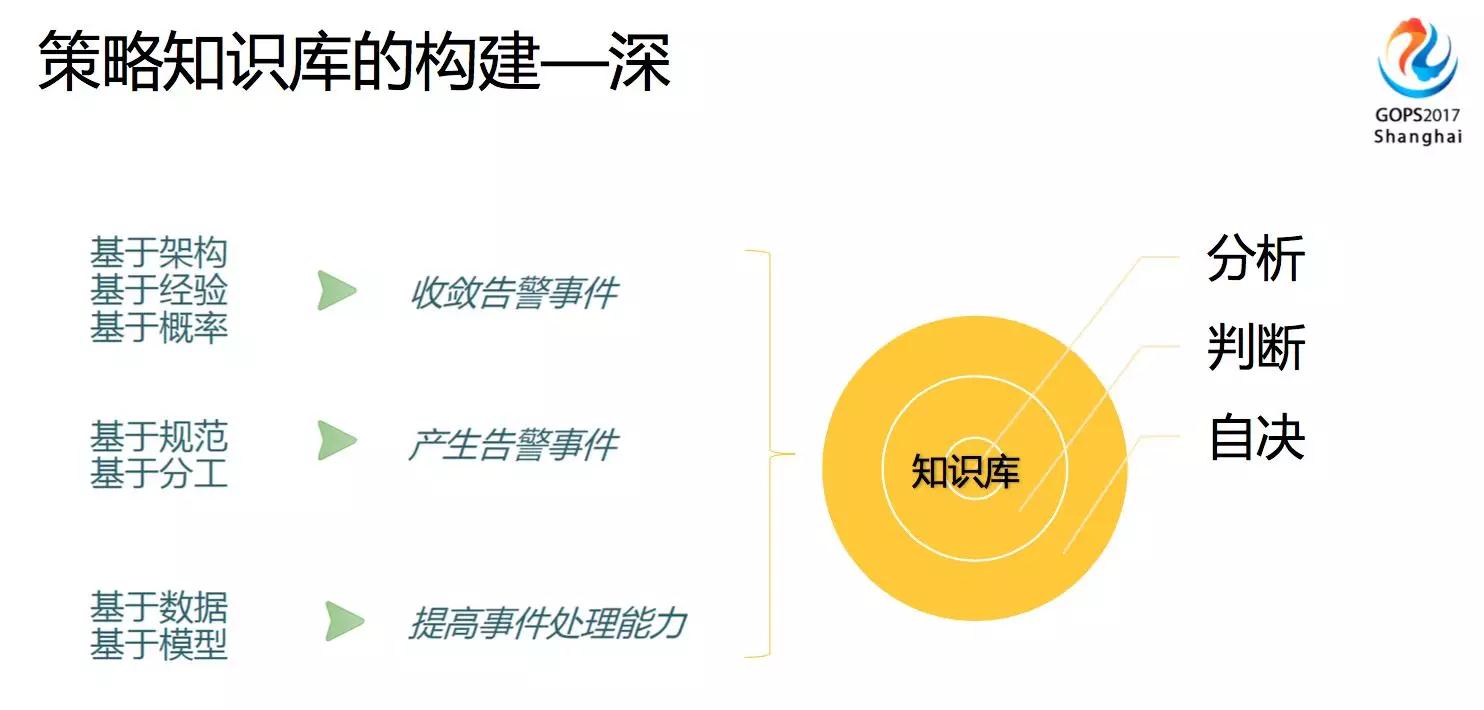 基于架构、工程师的经验和概率来做到收敛告警事件,基于规范和分工产生告警事件发送到对的人,基于数据和模型来提高事件的处理能力。很多事件有的工程师处理的特别快,反之如果对这个故障不熟悉的人可能花费的时间就很长。这就需要构建一个策略知识库,让其他人来参考和学习,提高同类场景事件处理的能力。