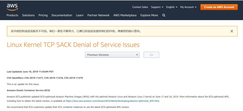 (AWS官网) 在这方面,AWS已发布三个修补这些Linux BUG的更新(),AWS Elastic Beanstalk,AmazonLinux,基于Linux的EC2实例,Amazon Linux WorkSpaces和Amazon的Kubernetes容器服务将受到这些BUG的影响。 一些服务,如Amazon ElasticCache如果使用默认配置将不会中招,但如果用户更改了默认配置,将会受到影响。 其他几个BUG,包含CVE-2019011478又名SACK Slowness,波及低于4.15版本的linux内核的系统; FreeBSD12受到另一个SACK Slowness漏洞CVE-2019-5599影响; CVE-2019-11479会导致系统过多资源消耗。 这三个linux缺陷和内核如何处理具有低值的最大报文段长度(MSS)的TCP SACK数据包相关,并受其影响。 RedHat在其公告中指出,影响仅限于“此时”的拒绝服务,并且不能用于泄露信息的提权。 SACK 是一种用于改善发送者和接受者之间的TCP丢包而引起的网络低效问题的机制。 起草SACK的IETF标准的工程师们解释说:“当一个数据窗口丢失多个数据包时,TCP可能会遇到性能问题。由于累积确认可用的信息受限,TCP发送方只能一个周期中只能知道一个丢包。主动发送可以选择提前重新发送数据包,但是这些重新发送的段可能已经被成功接收。 “选择性确认(SACK)机制与选择性重复重传策略相结合,可以帮助克服这些限制。接收TCP将SACK数据包发送回发送方,通知发送方已收到的数据。发送方只用重发丢失的数据段“。 据RedHat称,由于Linux TCP实现中使用的数据结构称为套接字缓冲区(SKB),该数据结构能够容最多17个分组数据片段,可能引发系统崩溃。 一旦SKB达到上限,结果可能导致内核错误(Kernel panic)事件。另外一个因素是最大报文段长度(MSS),或是指定最大承载数据的数量最大尺寸参数它指定重构TCP段中包含的数据总量。或者是最大承载数据数量的最大尺寸参数,此参数用于用于指定重构的TCP段中包含的数据总量。