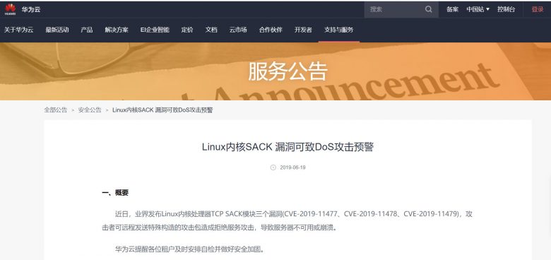 (华为云) Red Hat: https://access.redhat.com/security/vulnerabilities/tcpsack AWS: https://aws.amazon.com/cn/security/security-bulletins/AWS-2019-005/?nc1=h_ls SUSE: https://www.suse.com/de-de/support/kb/doc/?id=7023928 grsecurity: https://seclists.org/oss-sec/2019/q2/182 阿里云: https://help.aliyun.com/noticelist/articleid/1060012493.html?spm=a2c4g.789004748.n2.7.15386141GM8Eyl 腾讯云: https://cloud.tencent.com/announce/detail/622 华为云: https://www.huaweicloud.com/notice/2018/20190619122553544.html 参考链接: