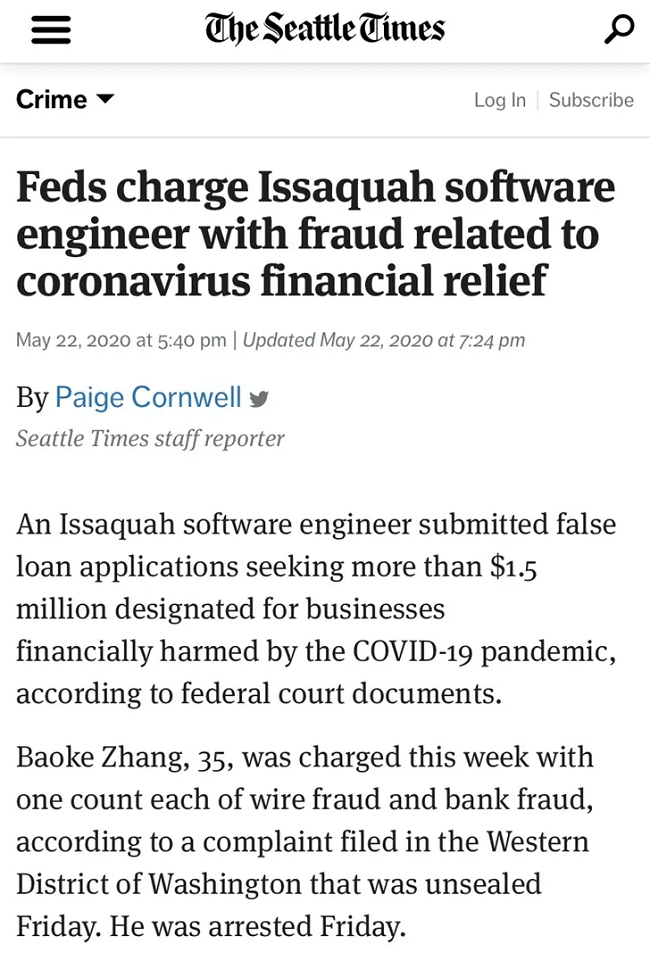 北京时间5月24日消息,据西雅图时报报道,一份美国联邦法院文件显示,一位来自中国的软件工程师Baoke Zhang(音译张宝科)被指控通过伪造企业信息,提交了目标超过150万美元的贷款申请。