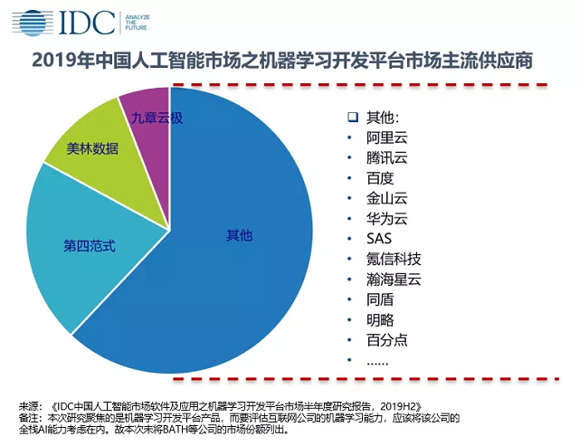 市场发展驱动力 算力不断提升:受益于加速计算技术的不断突破,机器学习、深度学习模型训练和推理速度持续提升,加快了AI应用产业化的进程。2020年GTC、英伟达更是发布了将算力再度提升数十倍的安培架构的A100 GPU。Intel 华为昇腾系列,Xilinx Alveo系列、寒武纪等也在特定领域为AI负载提供加速能力。算力突破将持续推动AI产业快速落地。 算法模型创新:在经典机器学习、CNN、RNN等神经网络的大分类下,厂商都在不断的推出面向应用场景优化的各种模型。 开源技术发展:包括主流开源框架Tensorflow,Pytorch,飞桨Paddle,推理框架MNN, TNN, Mace, Openvino等等,也包括上文提到的算法模型,开源发展使得技术推广应用更加便捷、高效。 厂商市场投入:不管是创企,还是大型互联网公司、IT巨头,在机器学习、深度学习领域积极投入资金、研发力量,致力于在机器学习这一人工智能的基础关键技术上有所突破,同时也在致力于降低机器学习开发门槛,让传统企业受益于人工智能。 驱动力足够,但市场发展的瓶颈也同样存在:数据资源就绪度,数据质量,能用来建模的数据量;有能力进行模型开发、模型优化的数据科学家;建模人员与行业专家对业务理解上的鸿沟;行业企业内部人员对机器学习、AI项目的配合程度;为机器学习、AI定位到合适的应用场景等等。 主流厂商介绍 本次是IDC第一次正式发布机器学习开发平台市场份额研究报告,本期收录了排名前三的厂商市场份额,同时也推荐了当前市场规模不明显,但值得关注的厂商。从市场格局的角度,部分厂商聚焦在金融反欺诈、智能营销场景,部分厂商聚焦在销量预测、智慧供应链、个性化营销、产品推荐系统,部分厂商聚焦在泛工业领域的设备预测性维护、工业质检巡检类应用。在应用较为落地的领域,会存在价格战等竞争,在较新的应用场景中,则更多的是同步探索的阶段。从产品层面,当前的差异化在于端到端开发工具的完备性,提供模型的丰富程度,对云服务的支持,开发过程可视化程度,平台产品的灵活性、易用性,以及产品整体的成熟度。