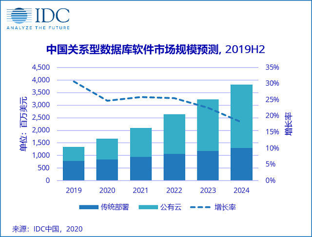根据IDC《2019年下半年中国关系型数据库软件市场跟踪报告》显示,2019年中国关系型数据库软件市场规模为13.4亿美元。其中,传统部署模式市场规模为7.9亿美元,公有云模式市场规模为5.5亿美元,整体市场同比增长30.8%。IDC预测,到2024年,中国关系型数据库软件市场规模将达到38.2亿美元,未来5年整体市场年复合增长率(CAGR)为23.3%。