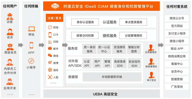 阿里云 IDaaS CIAM可以帮助企业整合现有的身份烟囱设计,作为业务中台的身份管理核心,通过统一身份工具连通互相隔绝的身份孤岛,实现顾客身份的统一管理,并为顾客提供跨平台、一致的无摩擦体验。 统一顾客体验 基于阿里云 IDaaS 强力的身份管理功能以及灵活配置的特点,在顾客身份跨服务认证通道收束于 IDaaS 后,企业可以避免让顾客在不同平台进行重复注册登录,为顾客提供统一的、广为接受的身份流程和体验。 良好的性能与可扩展性 阿里云 IDaaS CIAM以标准接口方式输出,支持任何类型的用户,使用任何终端来访问任何对客服务。同时,当企业有新的 APP、小程序上线时,可快速配置实现接入,无需二次研发。 安全合规 阿里云 IDaaS CIAM解决方案通过其密码策略和安全配置,提供符合等保合规要求的能力和标准,帮助企业满足合规要求,无需担心因身份安全问题可能导致的严重后果。 03、阿里云IDaaS CIAM 解决方案优势 超强性能 CIAM 的重大挑战之一是不同场景中经常出现的波峰流量。例如零售业的双十一、年中促销、反季促销、每日优惠会对流量压力带来的巨大的挑战。 阿里云IDaaS CIAM支持企业用户规模从几千人发展到上亿超大规模,千万级的高频访问,组件可横向弹性扩展,通过方案优化、逻辑优化、网络优化、存储优化等方面为客户提供极致的性能表现。 领先的 UEBA 用户认证行为分析 阿里云IDaaS CIAM可以针对顾客行为日志进行个性化分析,计算出顾客身份权限的安全基线,对越过基线的安全风险进行及时预警。同时分析结果可以做到千人千面,安全风险可视化,在大幅降低误报率的同时,提高身份伪造成本,为顾客账户安全带来实质提升。 创新的同意条款管理系统 中国企业的众多对客系统中,几乎都有各自独立的条款管理系统,形成「条款孤岛」现象,导致用户使用同一品牌的不同服务,需要反复地确认同意条款操作,且管理侧很难追踪某个时间断面上用户的同意状况。阿里云IDaaS CIAM 提供了条款统一管理并即时同步机制,有效化解孤岛问题,降本增效。 目前,阿里云CIAM解决方案已经在多个国际跨国企业落地实施。围绕着真实的用户体验,阿里云致力于助力企业构建安全、高效能、可扩展、统一的用户身份体系,帮助企业建立与顾客之间的连接纽带,从而稳定加速企业信息化、智慧化的过程,帮助企业在激烈竞争中争得顾客的信赖。 |