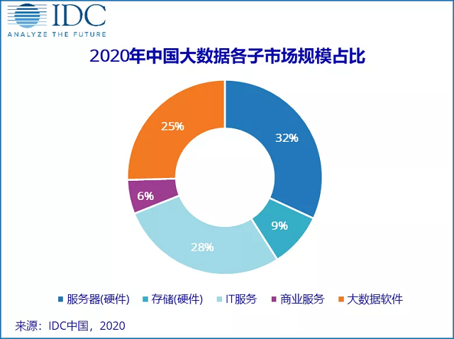 大数据细分市场 从子市场来看,2020年中国大数据市场最大的构成部分仍然来自于传统硬件部分——服务器和存储,占比超过40%,其次为IT服务和商业服务,两者共占33.6%的比例,剩余由25.4%的大数据软件所构成。从软件角度来看,2020年中国最大的三个细分子市场依次为终端用户查询汇报分析工具(End-User Query, Reporting, and Analysis Tools)、人工智能软件平台(AI Software Platforms)以及关系型数据仓库(Relational Data Warehouses),并且IDC预计,三者总和占中国整体大数据软件市场的比例接近50%。