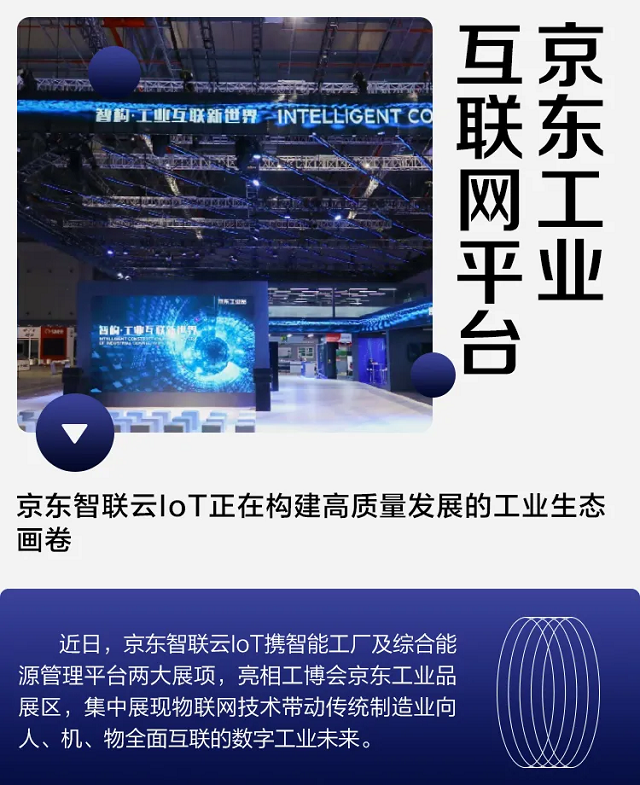 作为今年全国范围内首个线下举办的国家级工业展会,本届工博会以“智能、互联—赋能产业新发展”为主题,致力打造以线下为主,线上为辅的会展新模式。展会面积超过30万平方米,展商逾2600家,开设10大专业展,同期精彩活动50余场,预计逾18万中外专业观众参观。以全方位、立体式呈现数字化、网络化、智能化发展场景及产业化闭环,展现工业互联网新模式、新技术、新业态。 推动“中国制造”向“中国智造”转型 在当前工业互联网发展大浪潮之下,京东智联云IoT通过打造智能工厂平台,融合5G、AI、大数据等新技术,对接工厂提供产品管理、产能预售、订单聚合、物流仓储等综合能力服务,通过引导企业柔性组织产品设计、制造资源和生产流程,发展低成本的个性化定制,实现资源高效重组,重塑制造企业核心竞争力。 在智能工厂的建设过程中,京东智联云IoT帮助企业持续进行自动化、数字化和智能化改造,从顶层设计咨询、自动化生产线及物流设计、数据采集、数据管理、智慧园区、大数据分析与工业智能等方面进行数字化转型。
