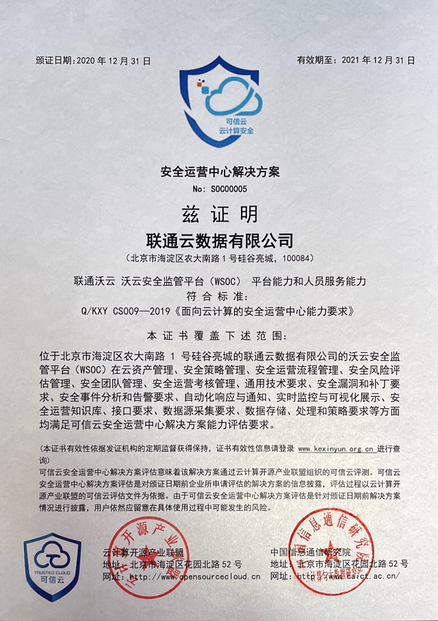 联通沃云:首家“可信云安全运营中心行业标准认证”电信运营商