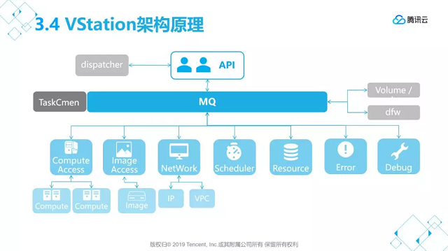 Compute,是宿主机上的 agent 程序,负责和后端通信,并调用 libvirt 等工具。 Compute Access,是 Compute 与后台架构通信的一个接入层。 Network,负责云主机的网络相关操作。 Image,负责云主机的镜像相关操作。 Scheduler,负责调度功能,为云主机挑选最佳宿主机。 Resource,负责资源数据的操作。 Volume,负责磁盘相关操作。