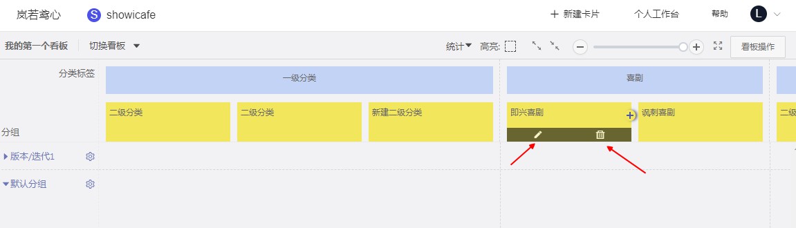 鼠标悬停至二级分类标签处,可直接进行编辑和删除操作(如果二级分类标签下存在关联卡片,则需先移出或删除卡片,才可执行删除操作)。
