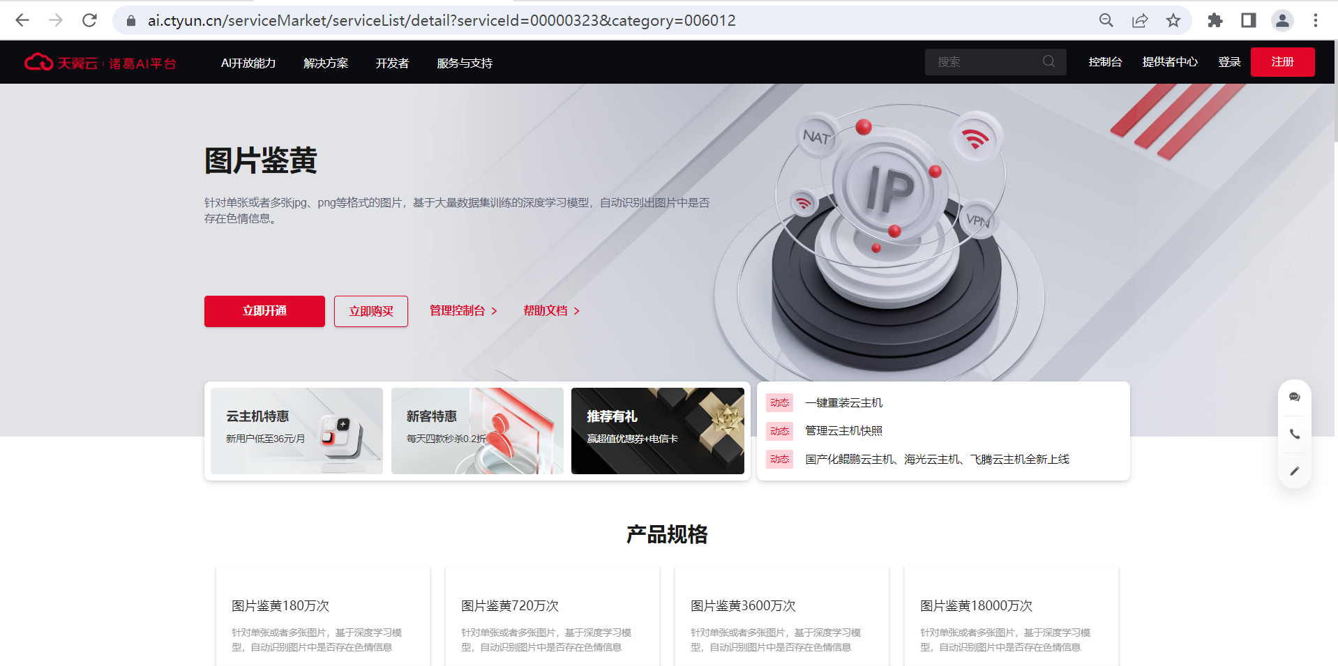 1.点击【产品-人工智能】,选择内容审核下的图片鉴黄;