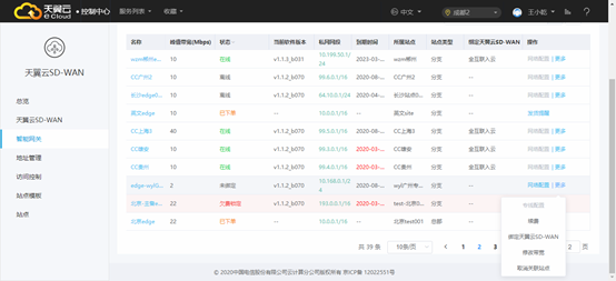 1、 登录控制台,在智能网关页点击待配置设备操作栏中的“更多-绑定天翼云SD-WAN”,弹出绑定配置弹框。