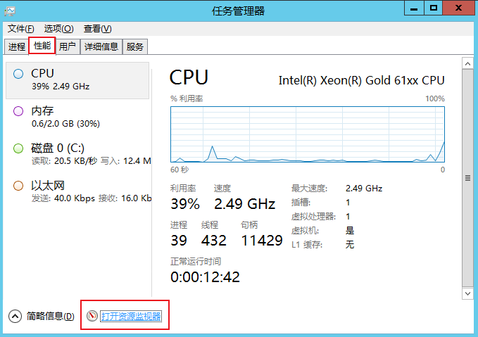 2. 选择性能页签,单击打开资源监视器。如下图所示:
