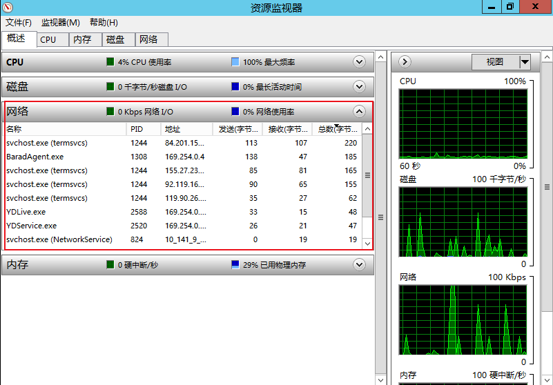3. 在打开的资源监视器中,查看消耗带宽较多的进程,并根据您的实际业务,判断此进程是否正常。如下图所示: