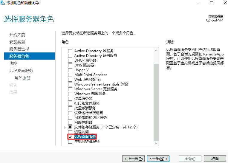 5. 在选择服务器角色界面,勾选远程桌面服务,单击下一步。如下图所示: