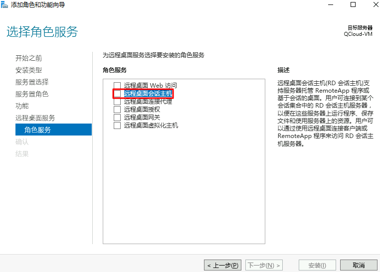 7. 在角色服务界面,勾选远程桌面会话主机。如下图所示: