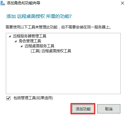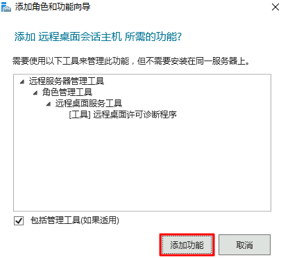 10. 弹出添加远程桌面授权所需的功能提示框。在提示框中,单击添加功能。如下图所示:
