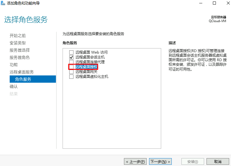 9. 在选择角色服务界面,勾选远程桌面授权。如下图所示: