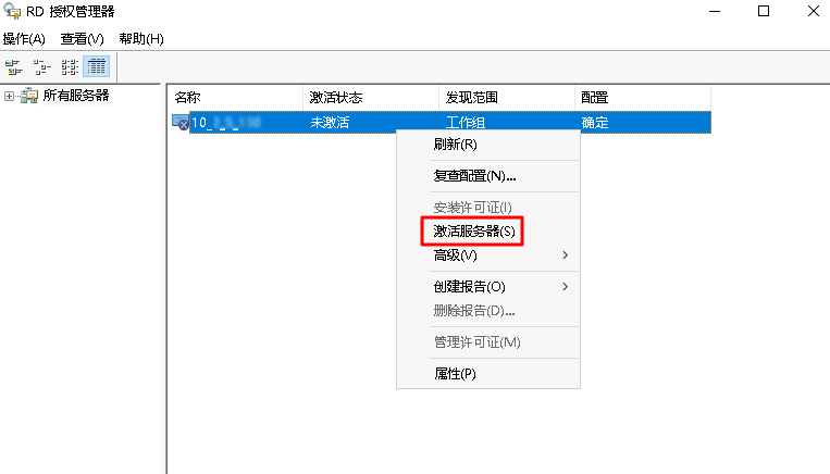 3. 在弹出的 RD 授权管理器窗口中,右键单击服务器所在行,并选择激活服务器。如下图所示: