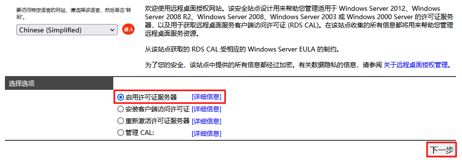 7. 在远程桌面授权网站中,选择启用许可证服务器,并单击下一步。如下图所示: